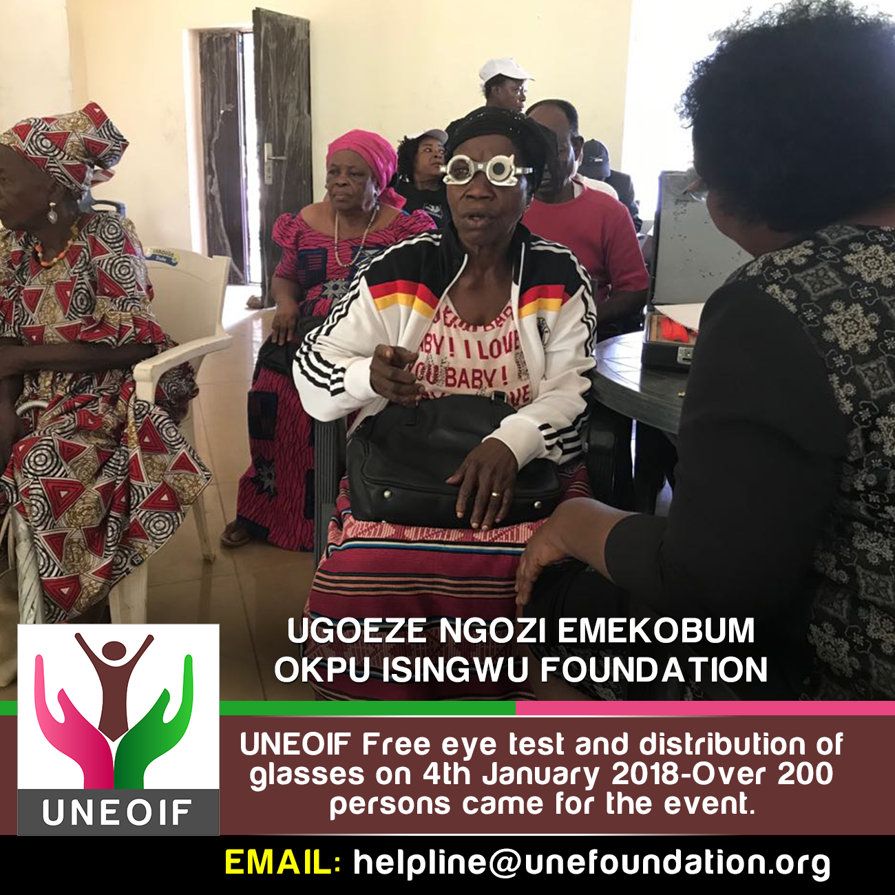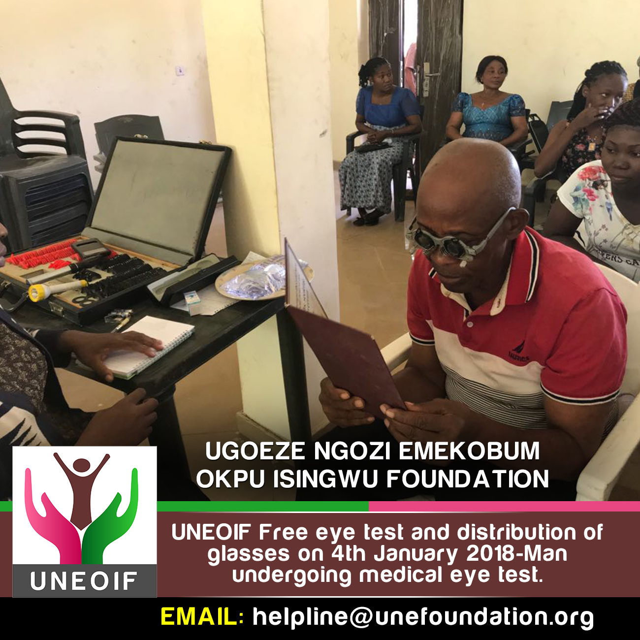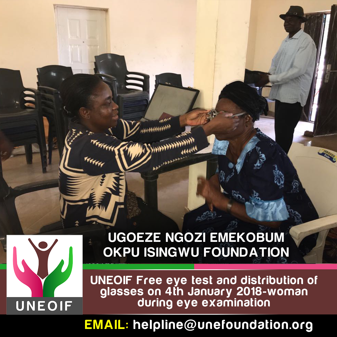 UNEOIF free medical eye test was held on 4th January 2018 at Umuahia, Abia State, Nigeria, in attendance were qualified medical practitioners and we had close to 200- person who attended the programme. They has their eyes examined medically and corrective glasses were given to them freely. Also, eye drops were given to those who require it.